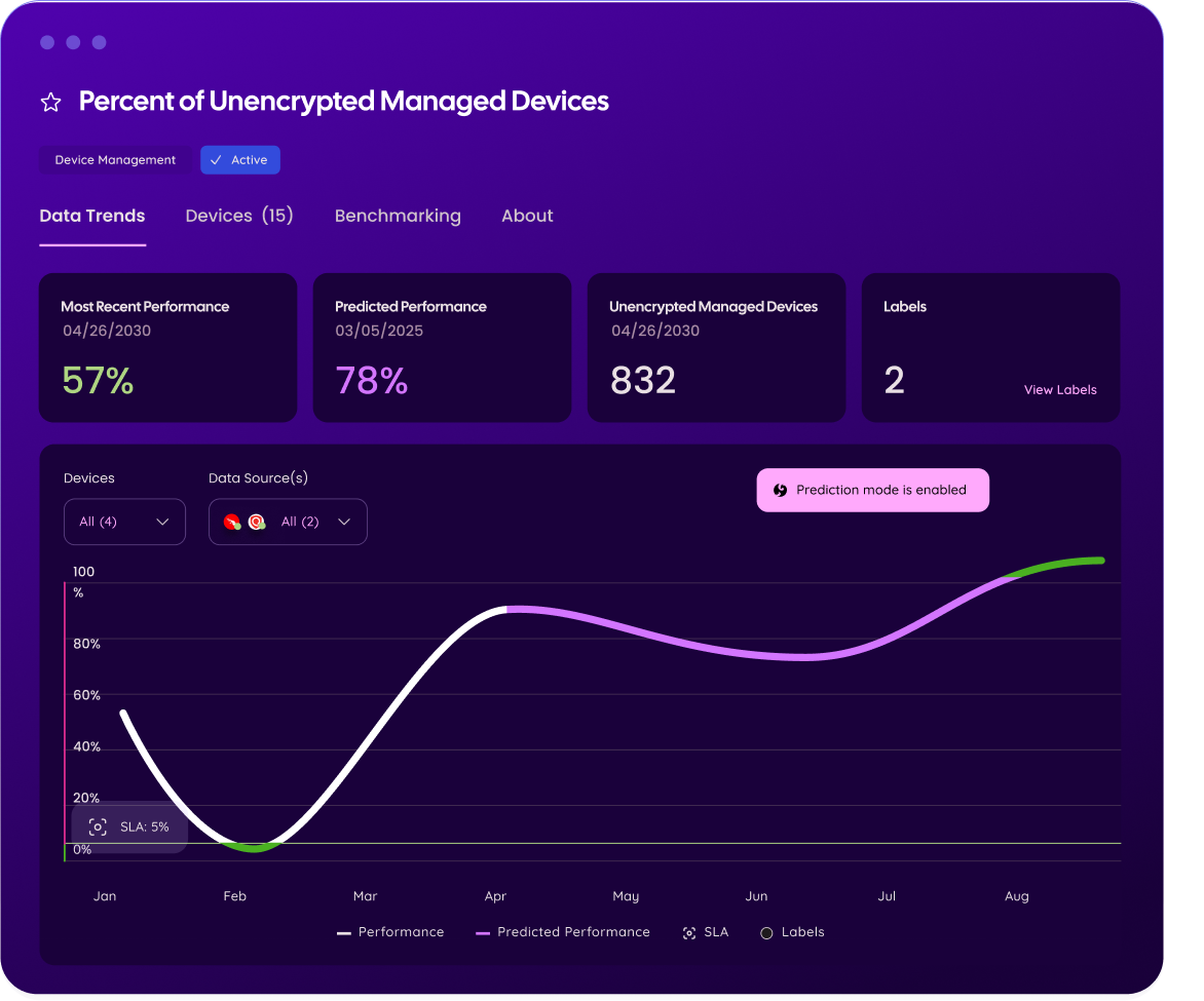 Nexa analyzes your historical performance, internal and external benchmarks, and other supporting data to predict your performance over the next 30 days. This enables you to proactively address compliance issues and improve your security posture.